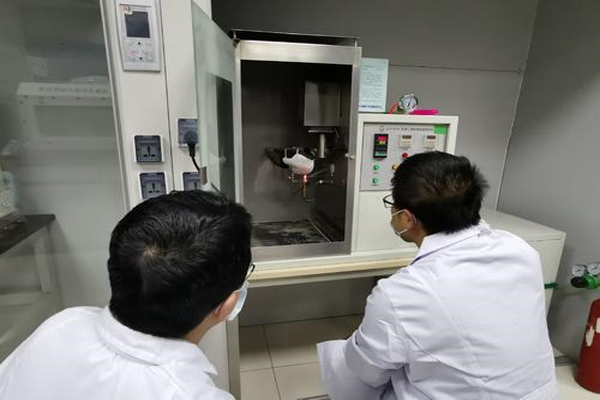记者看到,在口罩阻燃性能试验仪里,工作人员将一个口罩戴在头模上,开始启动机器点火。戴着口罩的头模以60毫米/秒的速度划过高40毫米、外焰温度800摄氏度左右的火焰,口罩的外表面因烧卷起一点。