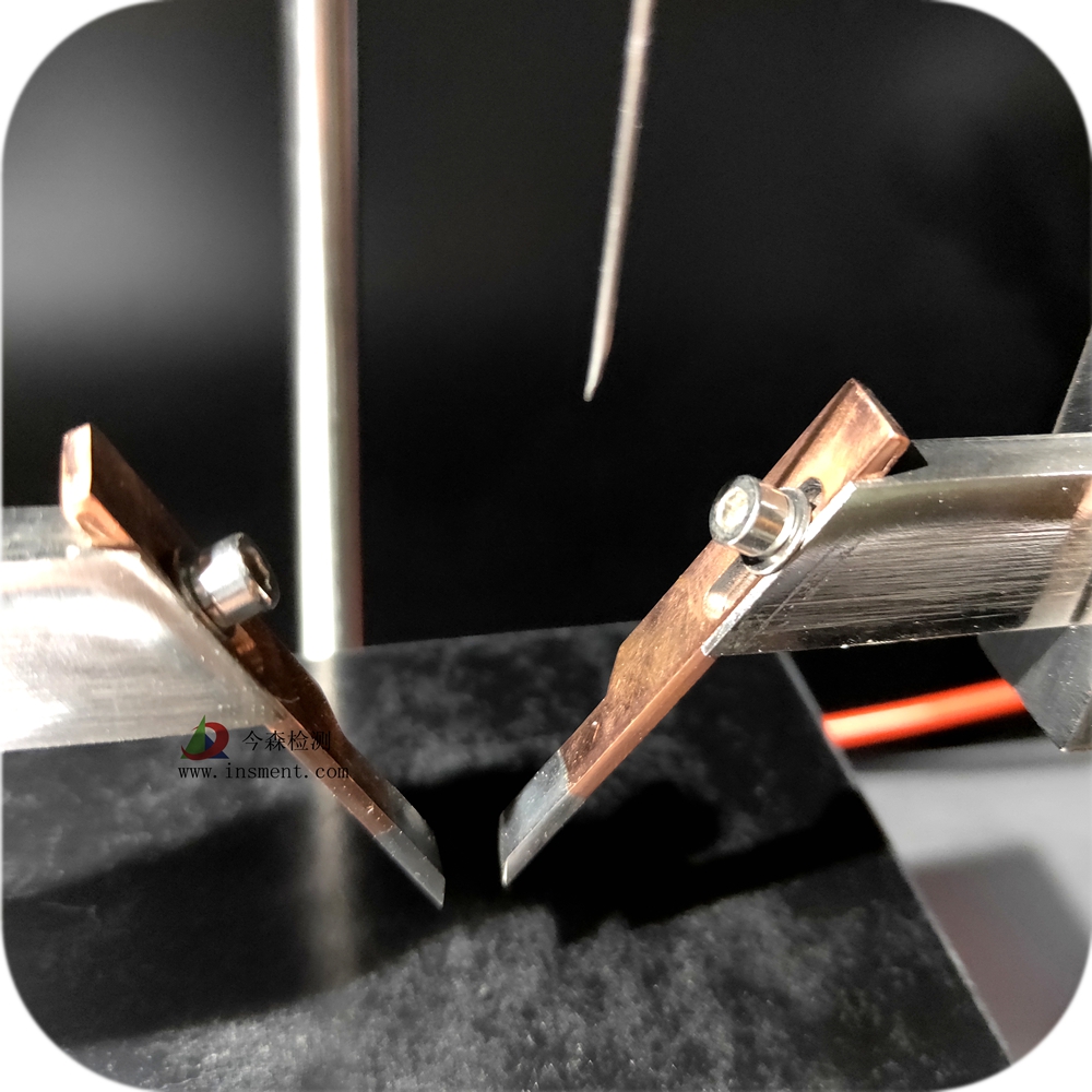漏电起痕试验是在固体绝缘材料表面上,在规定尺寸(2mm×5mm) 的铂电极之间,-施加某一电压并定时(30s)定高度(35mm)滴下规定液滴体积的导电液体(0.1%NH 4CL),用以评价固体绝缘材料表面在电场和潮湿或污染介质联合作用下的耐漏电性能,测定其相比电痕化指数(CT1) 和耐电痕化指数(PT1) 。