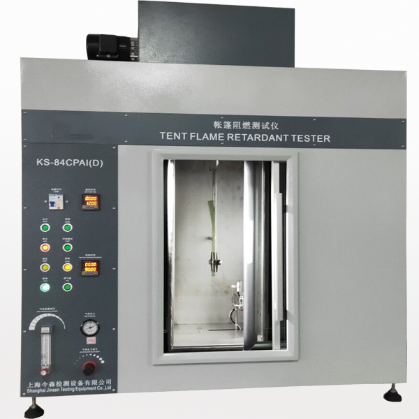 KS-84CPAI 帐篷燃烧试验机(新款) 是将样品安装于不锈钢样品夹上,挂在测试柜中,样品最低点于火源管上端距离为20mm;调整火源高度为38mm(±3mm)(测试用气体为甲烷);启动测试仪,使火源移到到样品正下方,烧12秒,移开火源,记录续燃时间;待所有的燃烧都结束后,取出样品,测量样品的损毁长度。