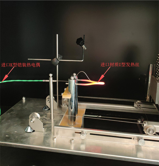 热电偶新标准1.0mm K 型原装德国绝缘式耐高温铠装热电偶,铠装套耐热 1100 ℃ ( 优于标准 1050 ℃ ) 能保证在960℃下连续运行(6h以上)。在实验过程中热电偶要伸进灼热丝试验部位并且保证测量点不偏移,应保持热电偶的顶部和钻孔的底部的热接触,确保热电偶能够随着灼热丝顶部因加热产生的尺寸变化而移动。灼热丝通过的热电偶反馈的温度显示值允许有一定的误差范围,标准规定在SK范围内都是可以接受的。要保证热电偶与灼热丝接触的一端清洁,没有留下样品燃烧后的残余物,否则试验仪器设定的温度与灼热丝施加在样品上的温度会有差别,灼热丝上的残留物会使施加到样品上的温度比实际的温度低,这可能导致不合格的产品被判为合格。