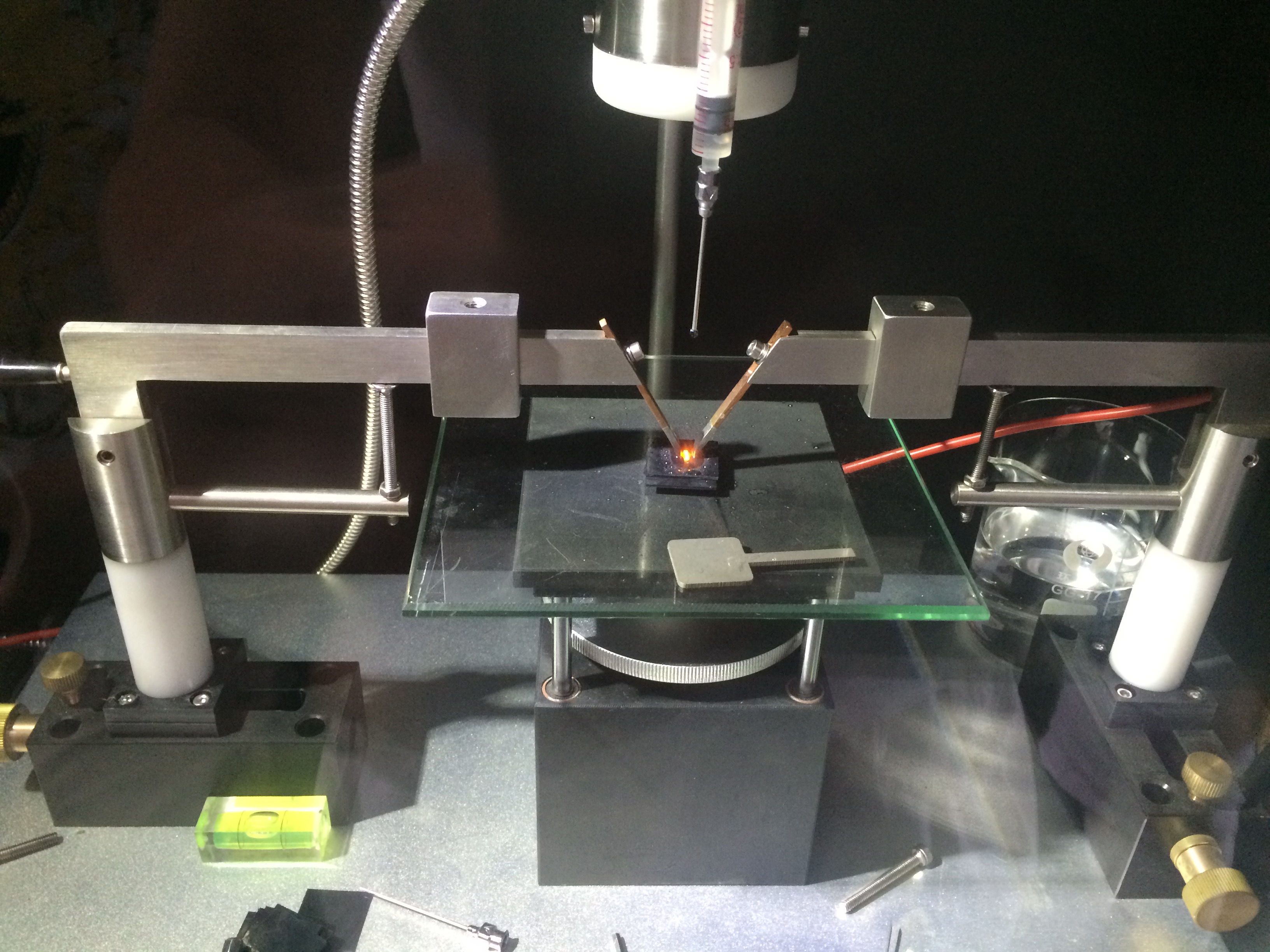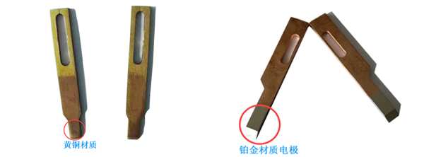 根据GB/T4207-2012《固体绝缘材料耐电痕化指数和相比电痕化指数的测定方法》试验要求规范,试验所使用的电极应使用最小纯度为99%的铂金电极,两电极间两电极应有一横截面(5±0.1)mm,有30°±2°斜面,斜面的刃近似为平面约0.01mm±0.1mm宽有的采用的是黄铜充当电极如,图1所示,完全不符合试验标准要求。KS-53系列的漏电起痕试验电极采用的是含量为99%的焊接铂金电极如图2所示,且通过了检测机构的计量审核。