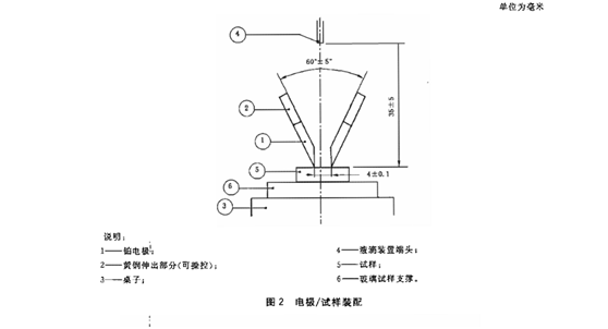 标准中规定在水平放置的的试样待测光滑平面上,两电极垂直相对且成60°±5°角,电极间距为