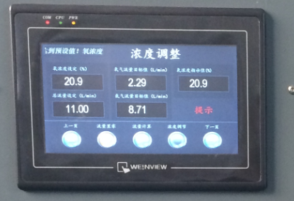使用WEINVIEW触摸屏PC 端操作软件,软件界面简洁明了,操作功能强大,易上手,以引导试验过程的思想设计。对氧气氮气流量的计算方法科学合理,保证氧浓度数值的准确性。软件操作界面如图2 所示。