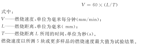 3、如果从实验计时开始,火焰在两个测量标线之间熄灭,为自熄试样,且不满足第二条试验结果,则按下例公式要求进行燃烧速度的计算,结果记为C-燃烧速度实测值mm/min。