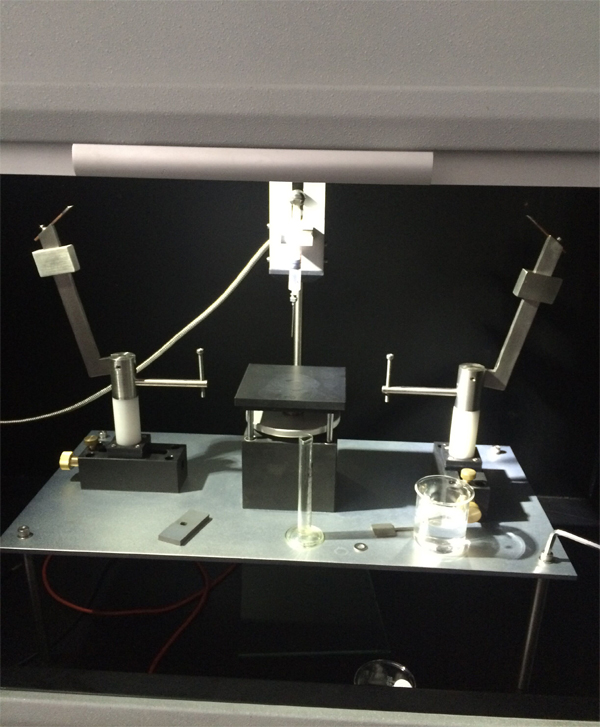 1)电极:A:5㎜×2㎜矩形铂金电极和黄铜电极各一对;B:电极符合IEC60112图B.1的尺寸要求:(5±0.1)㎜×(2±0.1)㎜×(≥12)㎜,其中一端凿尖角度为(30±2)°(即试验端呈30°±2°斜角),凿尖平面宽度为0.01㎜~0.1㎜;C:电极间所成角度为60°±5°,间距为(4±0.1㎜);