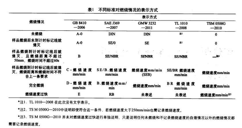 汽车内饰材料性能及试验方法阻燃性国需满足FMVSS 302,日本需满足TRIAS 48,在国内销售的汽车需满足GB 8410《汽车内饰材料的燃烧特性》。